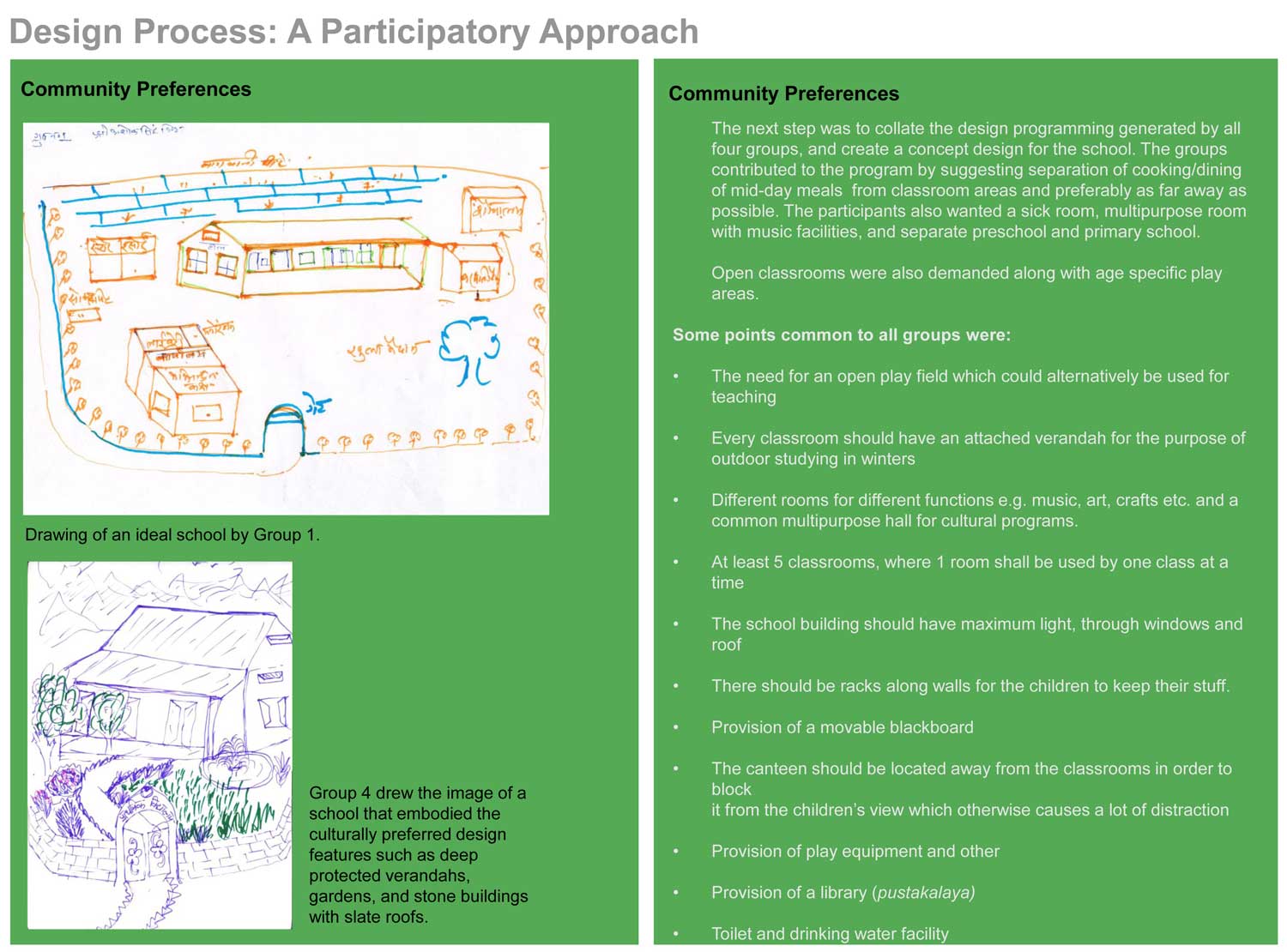 In a workshop conducted by Dr. Sudeshna Chatterjee, participants talked about their experiences with existing schools in the district. Working in four groups, they came up with a design program. Through a consensus building process using the ideas from all groups, a concept for an ideal rural school was developed and agreed upon.