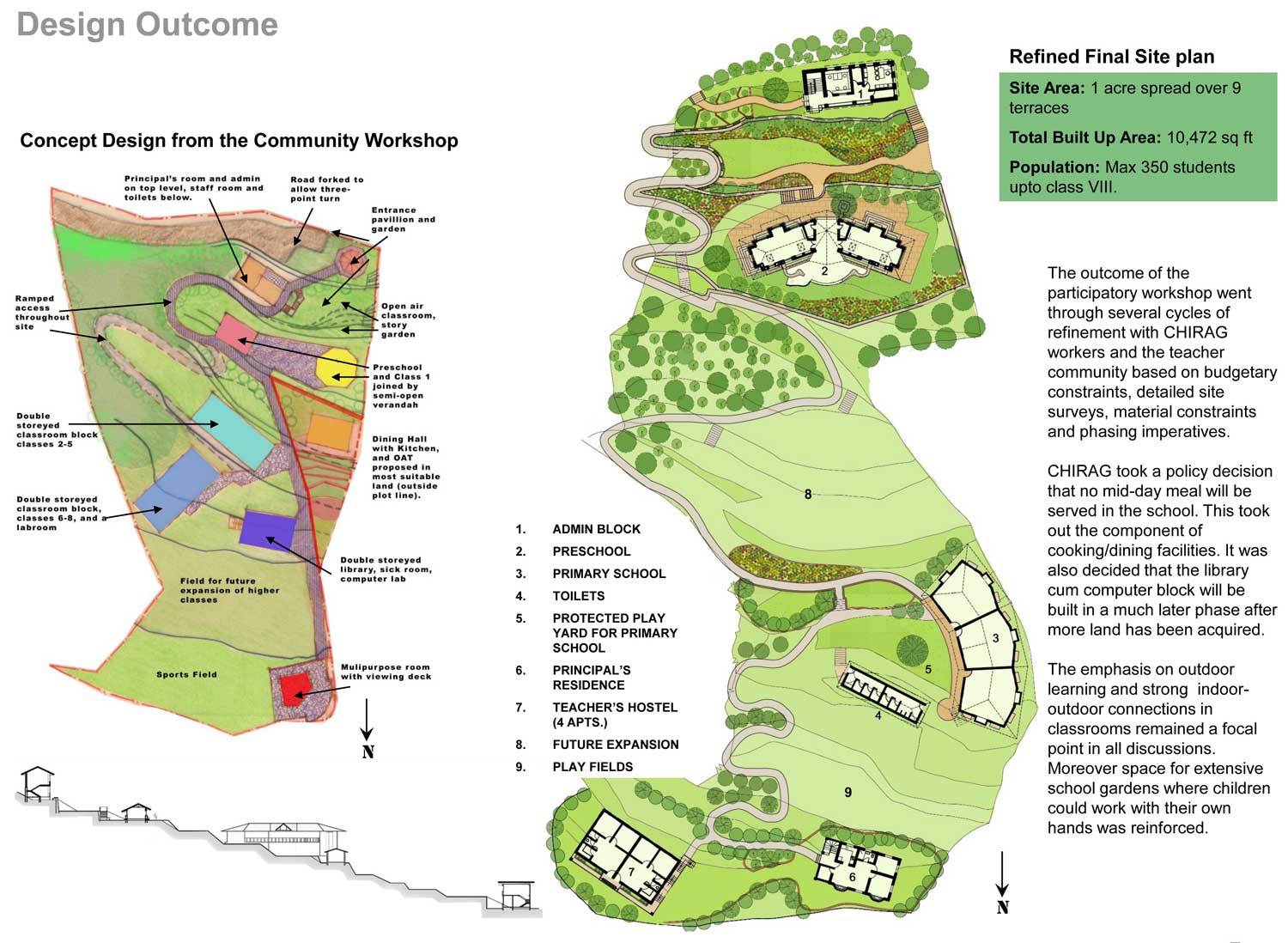 The idea for The CHIRAG Environmental school for rural children is rooted in the values of sustainable development and democracy. The design for the school evolved from a participatory design process where the school community, village chiefs, education workers, students and parents participated in co-creating an ideal rural school.