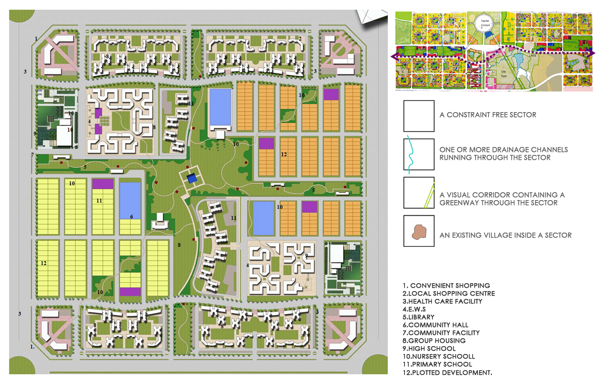 The urban design for residential area aims to create a pedestrian friendly environment. Each sector is only 800 meter in any direction. The residential neighborhoods, internally are walkable and cyclable.